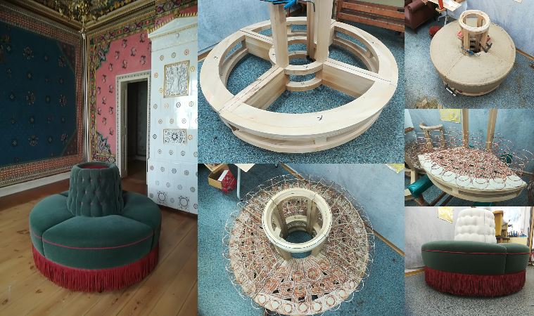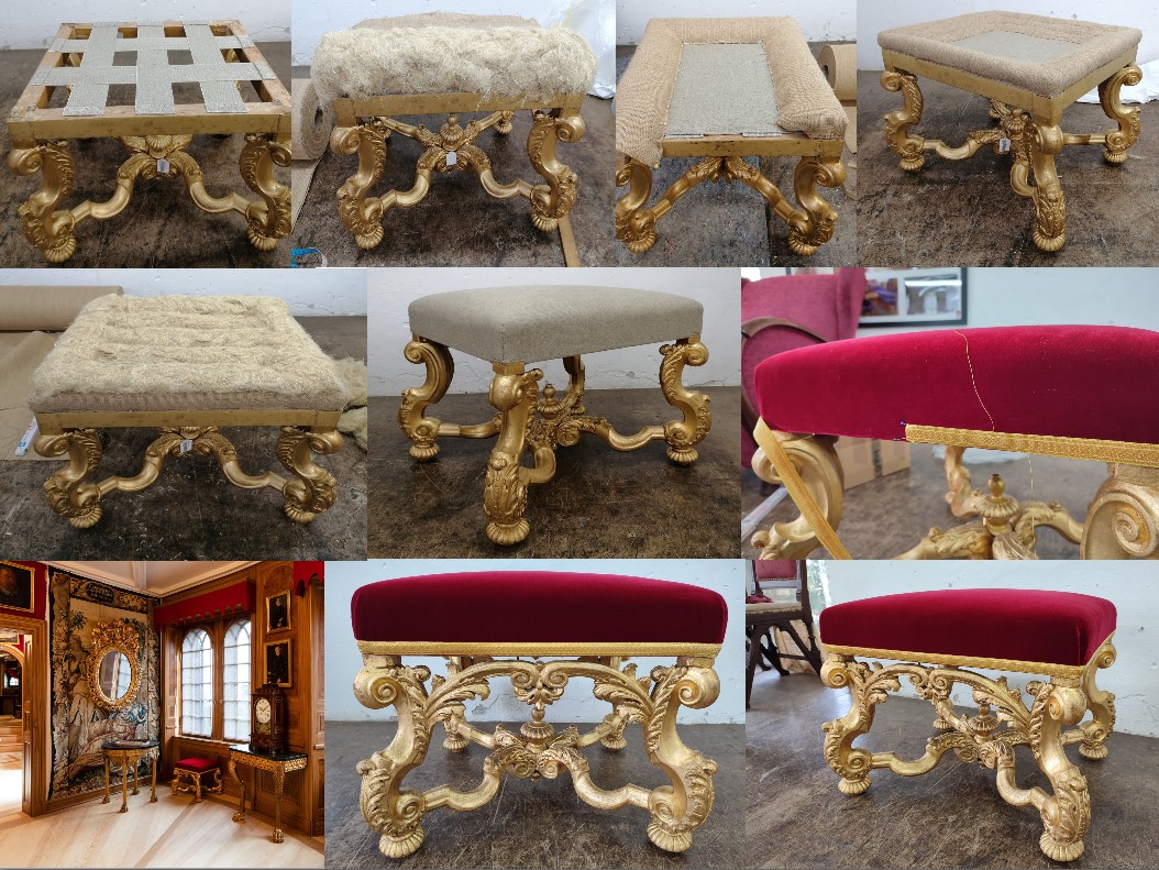 Löwenburg Kassel, Rekonstruktion Polsterung von 6 Tabourets ohne Verwendung von tierischen Füllstoffen . Herstellung umlaufender Bourlets in zeittypischer Ausführung. Bezug mit Seidensamt und rekonstruierter Bordüre.