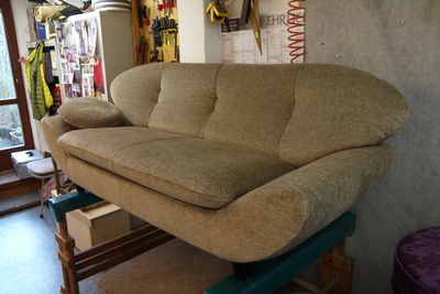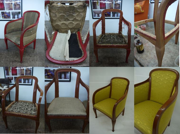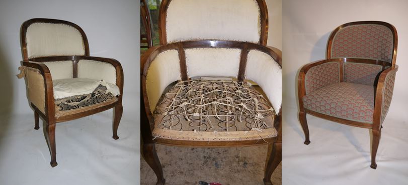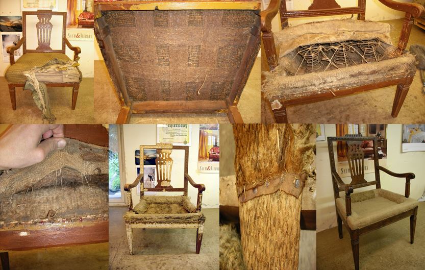 Bei diesem Bsp. wurde die original Polsterung erhalten und mit minimalen Mitteln wieder geschlossen. Ziel ist den Bestand der Polsterung komplett zu erhalten. Eine solche Polsterung ist für eine museale Verwendung geeignet und nur bedingt für den täglichen Gebrauch. Der Bezugsstoff ist ein Original um 1910 der zur Verfügung stand.