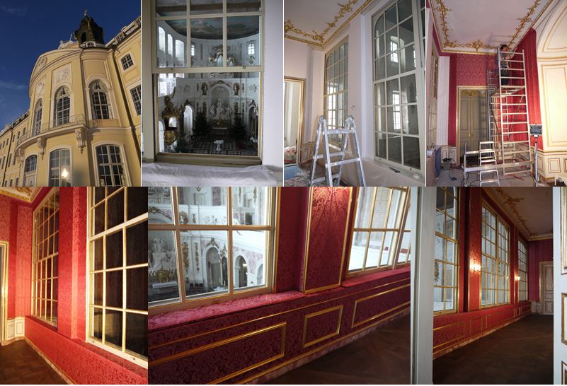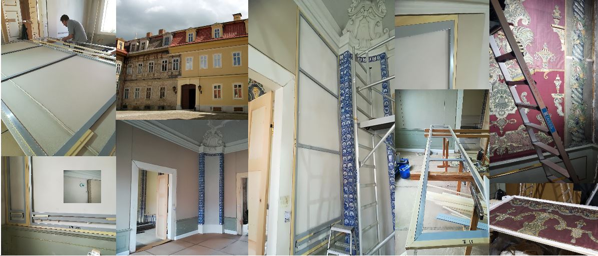 Herstellung und Montage von Spannrahmen als Alu-Holzkonstruktion. Bespannt mit Leinen zur Aufnahme der Restaurierten Bespannungen im Schmelzzimmer. Die Rahmen sind nach den Flächenmaßen der historischen Bespannung hergestellt. Alle Rahmen sind abnehmbar auf Magneten gelagert. Starke Unebenheiten der Wände konnten ausgeglichen werden.