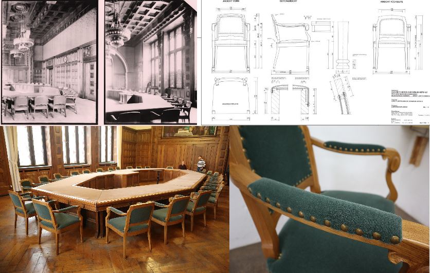 Rekonstruktion/Polsterung von 57 Armlehnstühlen, Eiche massiv, teilw. geschnitzt nach einem historischen Foto .