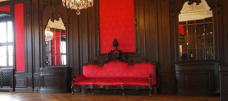 Diese Wandbespannung wurde in einer restaurierten Wandvertäfelung ausgeführt. Teilweise mussten fehlende Spannleisten ergänzt werden. Für diesen Raum wurden zusätzlich 2 Neobarocke Bänke gepolstert und mit dem Stoff der Bespannung bezogen. Die Polsterung wurden wieder in passender Formensprache und Materialien ausgeführt. Der Stoff hat eine Breite von 52cm und wurde von der Fa. Eschke hergestellt.
