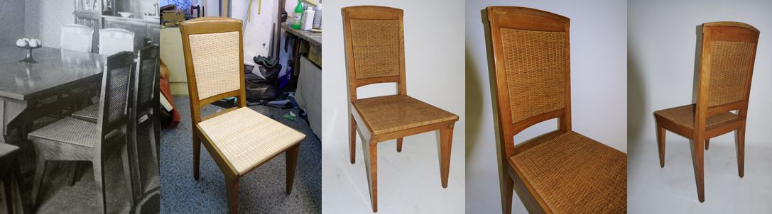 Rekonstruktion der geflochtenen Sitz und Lehnfläche für einen vorher mit Stoff überpolsterten Stuhl.
