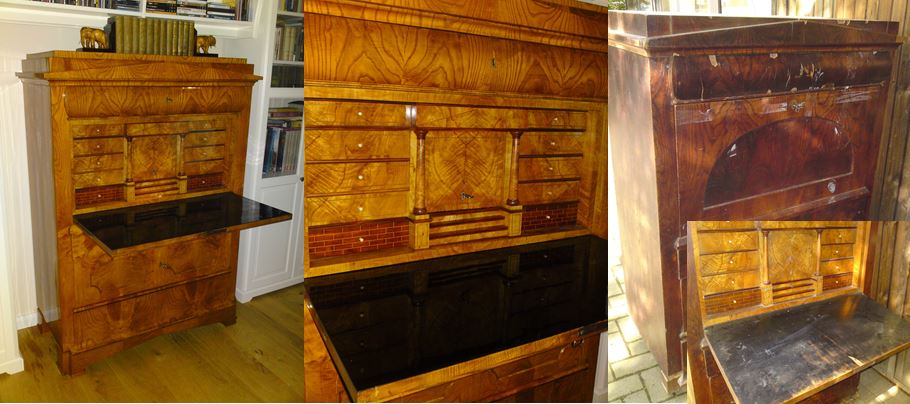 Wir restaurieren Möbel deren Furnierschäden und arbeiten die Oberflächen passend zur Zeit auf. Hier eine Schellackpolitur bei einem Sekretär um 1830